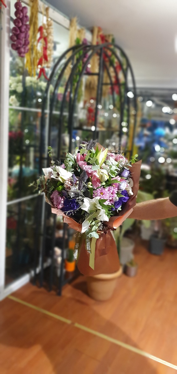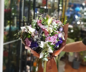 Beyaz Kazabilanka, Mor İsiatüs ve Şakayık'tan oluşan buketimiz.
